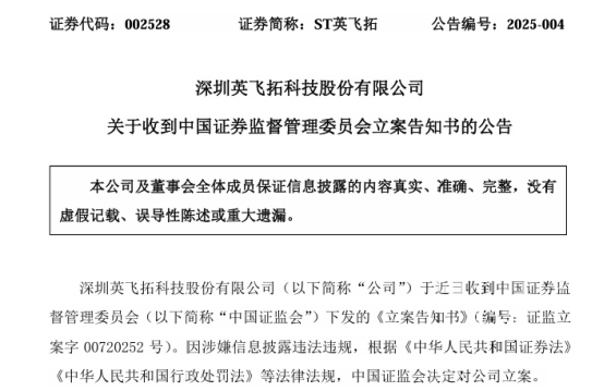 2025年1月24日,ST英飞拓公告近日收到中国证监会下发的《立案告知书》。因涉嫌信息披露违法违规,中国证监会决定对公司立案。