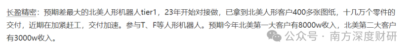 目前公司已拿到北美机器人客户400多张图纸,十几万个零件在加速交付,预期今年北美第一大客户有8000万收入,北美第二大客户有3000万收入。