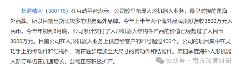 今年上半年,机器人业务给公司贡献了3800万收入,同比增长2.3倍。今年初到8月底,公司人形机器人结构件累计交付价值超8000万元。