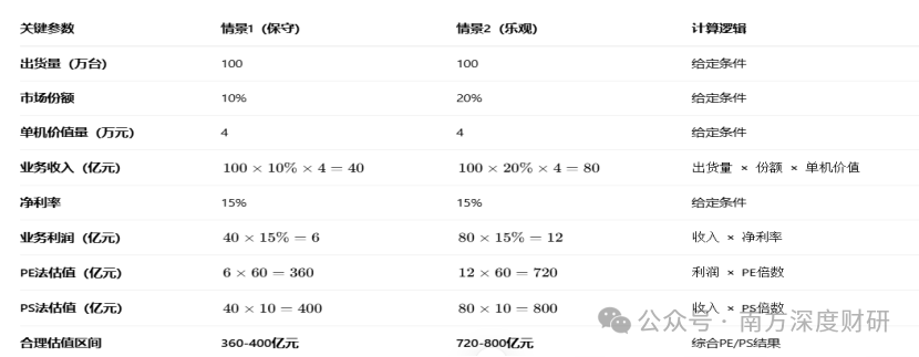 假设2027年,机器人出货量100万台,公司市场份额20%,净利率15%,这块业务利润,给60倍PE,或者10倍PS,这块业务估值合理区间在360-400亿