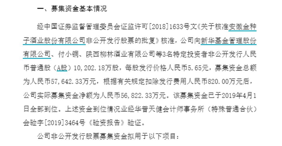 公告显示,公司2019年4月完成非公开发行股票,募集资金总额5.76亿元,扣除发行费用后实际净额5.68亿元,拟投入“优质基酒技术改造及配套工程项目”(以下简称优质基酒项目)和“营销体系建设项目”(以下简称营销体系项目)两大核心项目。