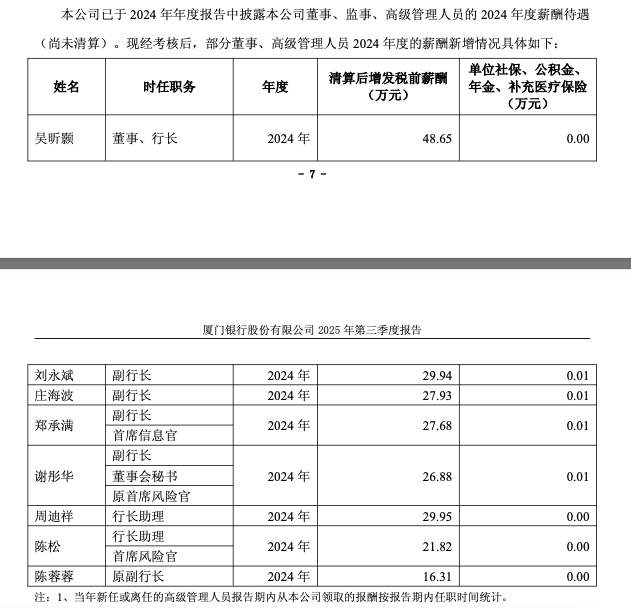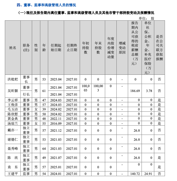 2024年年报显示,董事长洪枇杷2025.04上任,2024年从公司获得的税前薪酬总额为0。董事、行长吴昕颢2024年从公司获得的税前薪酬总额为186.69万元,清算后增发税前薪酬48.65万元,纪委书记黄俊婷2024年从公司获得的税前薪酬总额为97.45万元,副行长、董事会秘书、原首席风险官谢彤华2024年从公司获得的税前薪酬总额为133.60万元,清算后增发税前薪酬26.88万元,原董事、原董事长姚志萍2024年从公司获得的税前薪酬总额为167.08万元。以上人员均未在公司关联方获取薪酬。