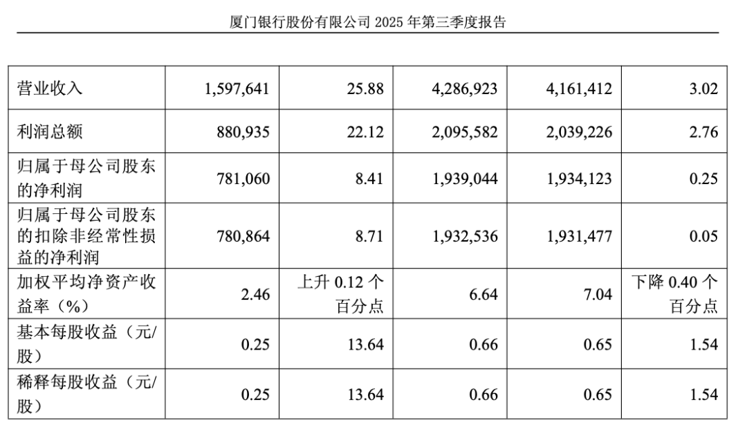 厦门银行(601187)发布2025年三季度报,今年前三季度,公司实现营收42.87亿元,同比增长3.02%;归属于上市公司股东的净利润19.39亿元,同比增长0.25%。其中,第三季度营收为15.98亿元,同比增长25.88%;归属于上市公司股东的净利润7.81亿元,同比增长8.41%。截至2025年9月末,公司不良贷款率0.80%,比2024年期末增长0.06个百分点。拨备覆盖率304.39%,比2024年期末减少87.56个百分点。