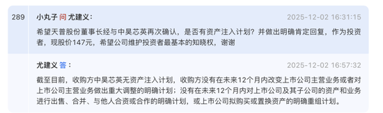 此次说明会上,尤建义再次向投资者明确,收购方中昊芯英无资产注入计划,收购方没有在未来12个月内改变上市公司主营业务,或者对上市公司主营业务做出重大调整的明确计划;没有在未来12个月内对上市公司及其子公司的资产和业务进行出售、合并、与他人合资或合作的明确计划,或上市公司拟购买或置换资产的明确重组计划。