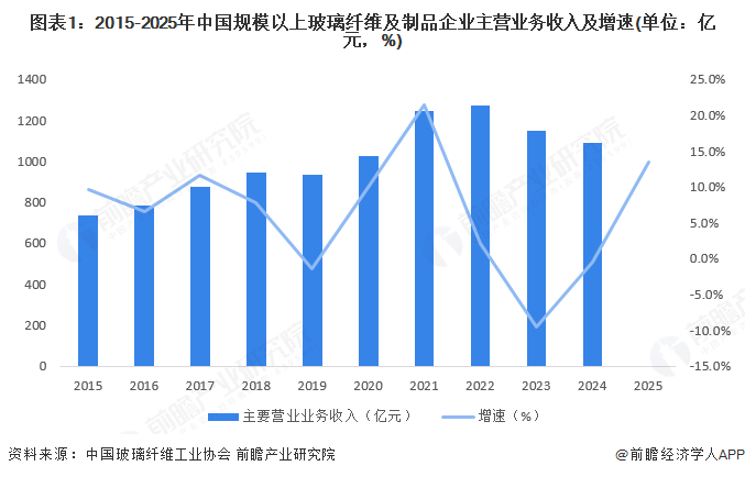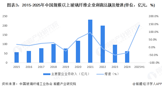 2015-2022年,中国规模以上玻璃纤维及制品企业主营业务收入呈现波动上升趋势。2023年中国规模以上玻璃纤维及制品企业主营业务收入同比下降9.6%,约为1148亿元。2024年主营业务收入约为1091亿元,同比下降0.5%。2025年上半年,受下游需求增长,供给端产能调控,产品价格回收等因素的影响,中国玻璃纤维行业主营业务收入上升13.5%。