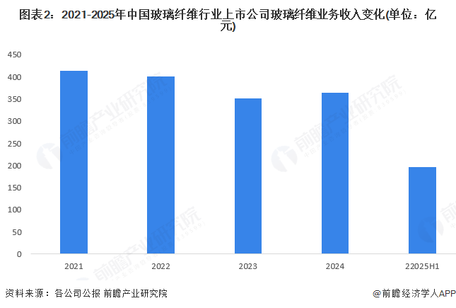 从行业内主要上市公司玻璃纤维业务收入总规模看,2022年和2023年持续下降,2024年主要上市公司玻璃纤维业务收入总规模为363亿元,较2023年提升3.25%。2025年上半年,主要上市公司玻璃纤维营收合计为196亿元。