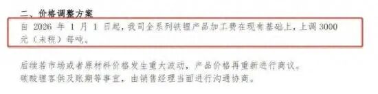 一家磷酸铁锂龙头企业在近期的价格调整方案中称,自2026年1月1日起,公司全系列铁锂产品加工费在现有基础上,上调3000元(未税价)每吨。后续若市场或者原材料价格发生重大波动,产品价格再重新进行商议。