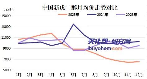据买化塑研究院监测数据显示,新戊二醇价格在4月达到年内高点12000元/吨后,便开启了直线下滑模式,历经7个月的持续下行,于11月底触及6400元/吨的年内最低点,最大跌幅超46%,市场情绪一度降至冰点。而12月的价格反弹,正是在这一超跌基础上形成的修复性行情,市场对底部位置的认可度逐步提升。