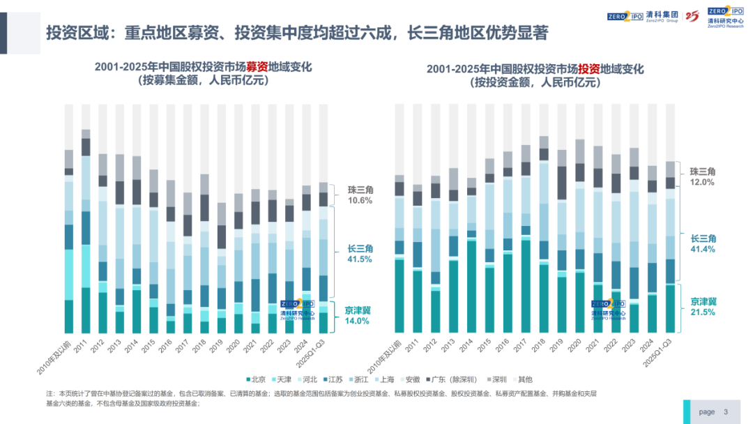 区域的变化也值得关注。募资上,京津冀地区前三季度的募资金额占全国总募资额的14%,珠三角是10.6%,而长三角达到了41.5%——几乎是京津冀加上珠三角之和的两倍。投资上,京津冀地区连续三年回升,今年该地区发生的投资金额占比21.5%,珠三角是12%,长三角为41.4%,以及湖南的投资特别活跃。