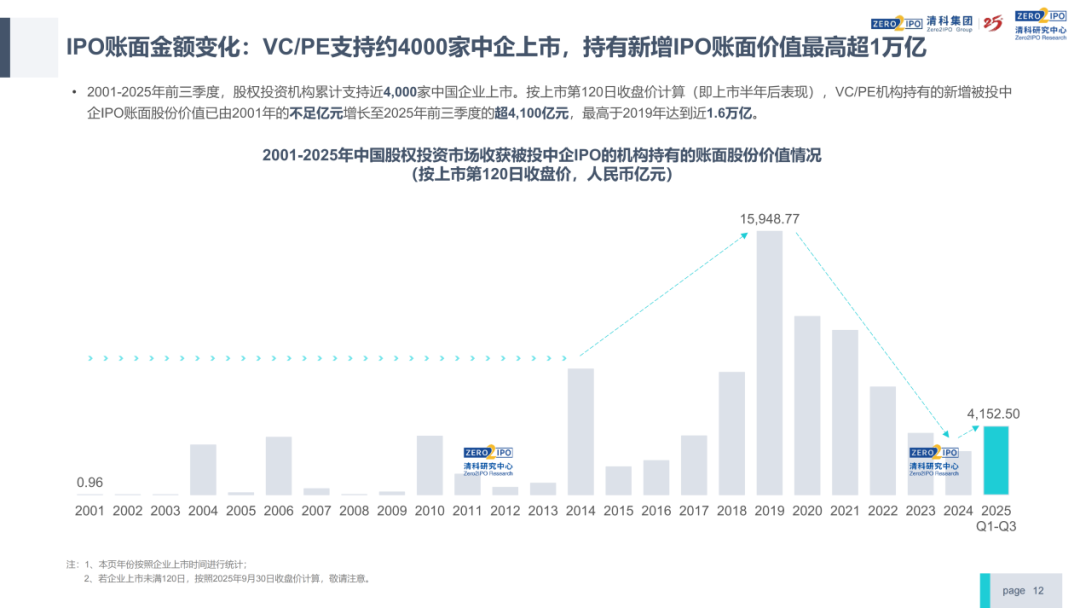 那么,这些年大家退了多少钱?这份数据堪称晴雨表,25年来股权投资机构累计支持近4000家中国企业上市。按上市第120日收盘价计算(即上市半年后表现),在2001年,VC/PE机构持有的新增被投中企IPO账面股份价值仅不足亿元。最赚钱的年份是2019年,创下最高纪录达到近1.6万亿。