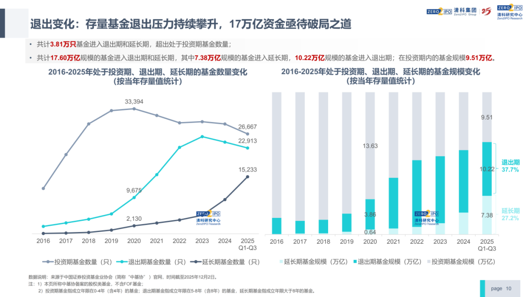 现在,国内创投有共计3.81万只基金进入退出期和延长期,共计17.60万亿规模的基金进入退出期和延长期,VC/PE的压力显而易见。