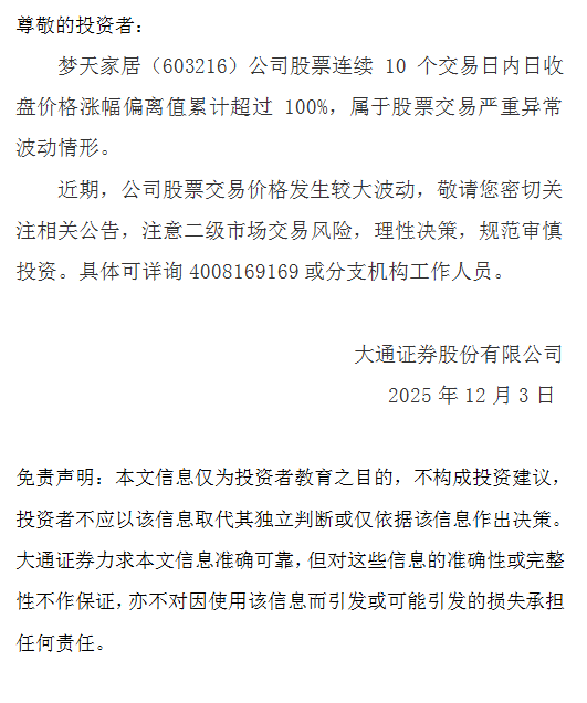 【风险提示】关于梦天家居(603216)交易风险提示公告