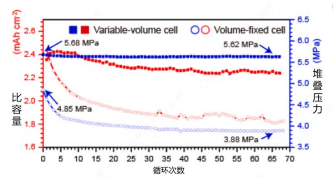 压力分为初始加压和堆叠压力两个问题。由于电池在日常循环中的“呼吸”造成的膨胀,除了初步制造中保持固固有效接触之外,保持使用中的良好的固固接触难度也很大。本质上看,电池性能的发挥前提是固固界面的良好有效接触,这分为两个问题,一个是电池制造中实现良好接触,电极制备压延过程中的外部压力通常为几十、几百MPa,甚至几个GPa,称为制备压力,即解决一次加压问题;另一个在使用中在不断的膨胀中实现良好加压,从而保持固体和固体间的良好接触,即解决堆叠压力问题,这影响电极和电解质的孔隙率和离子电导率等。