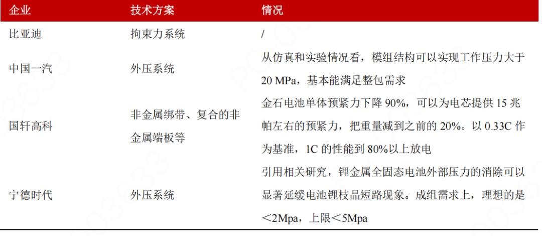 图表32:部分全固态电池企业电池结构层面的外压力方案等