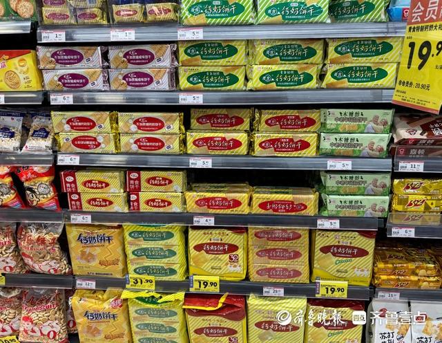 12月1日,在济南大润发(历下店)的饼干销售区,钙奶饼干被醒目地陈列在货架上。货架上既有经典的黄色包装精制钙奶饼干,也有老年硒锌款、无蔗糖款等多款细分产品,供消费者选购。