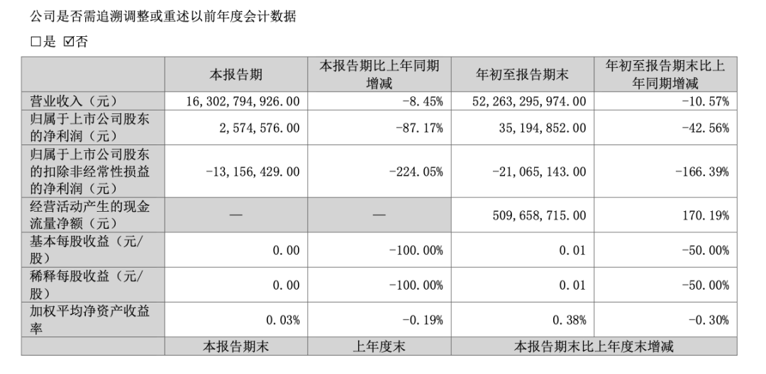怡亚通(002183)发布2025年三季度报,今年前三季度,公司实现营收522.63亿元,同比下降10.57%;归属于上市公司股东的净利润3519.49万元,同比下降42.56%。其中,第三季度营收为163.03亿元,同比下降8.45%;归属于上市公司股东的净利润257.46万元,同比下降87.17%。