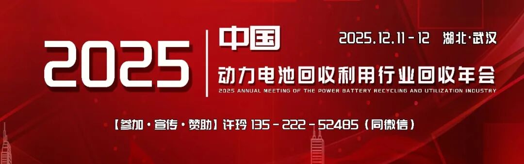 由中国电子节能技术协会电池回收利用专业委员会、格林美集团(武汉动力再生)、动力电池回收网主办,“2025中国动力电池回收利用行业回收年会”。武汉瑞科美新能源有限责任公司、山东动力电池回收利用协会、江西省动力电池回收利用协会协办,动力电池回收与梯次利用联盟大力支持的“2025中国动力电池回收利用行业回收年会”将于2025年12月11-12日在武汉召开。参观格林美武汉动力电池回收工厂(名额40人)。参会联系人:许玲13522252485(同微信)