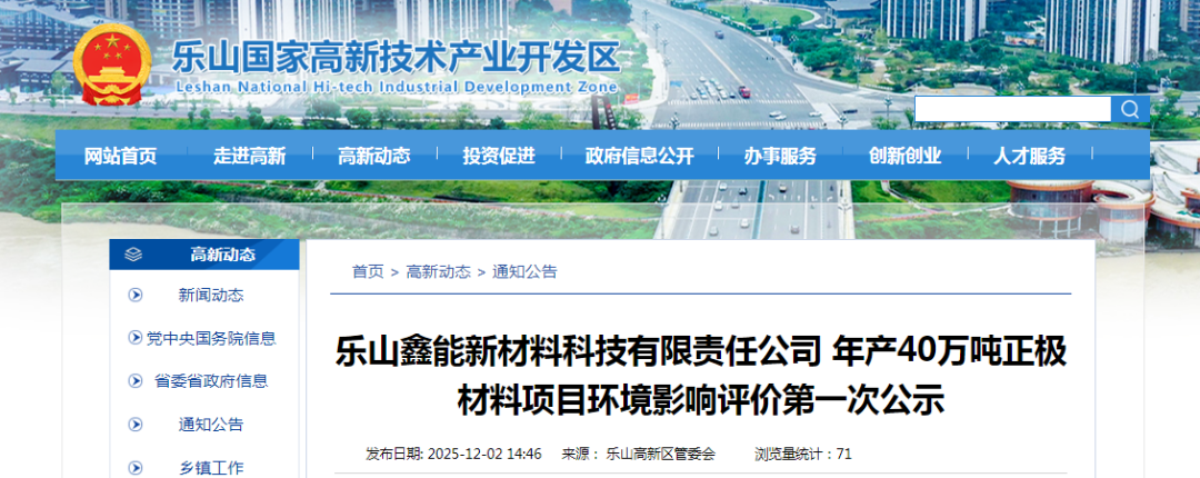 近日,乐山鑫能新材料科技有限责任公司正式对外发布了《乐山鑫能新材料科技有限责任公司年产 40 万吨正极材料项目》的环境影响评价第一次公示。