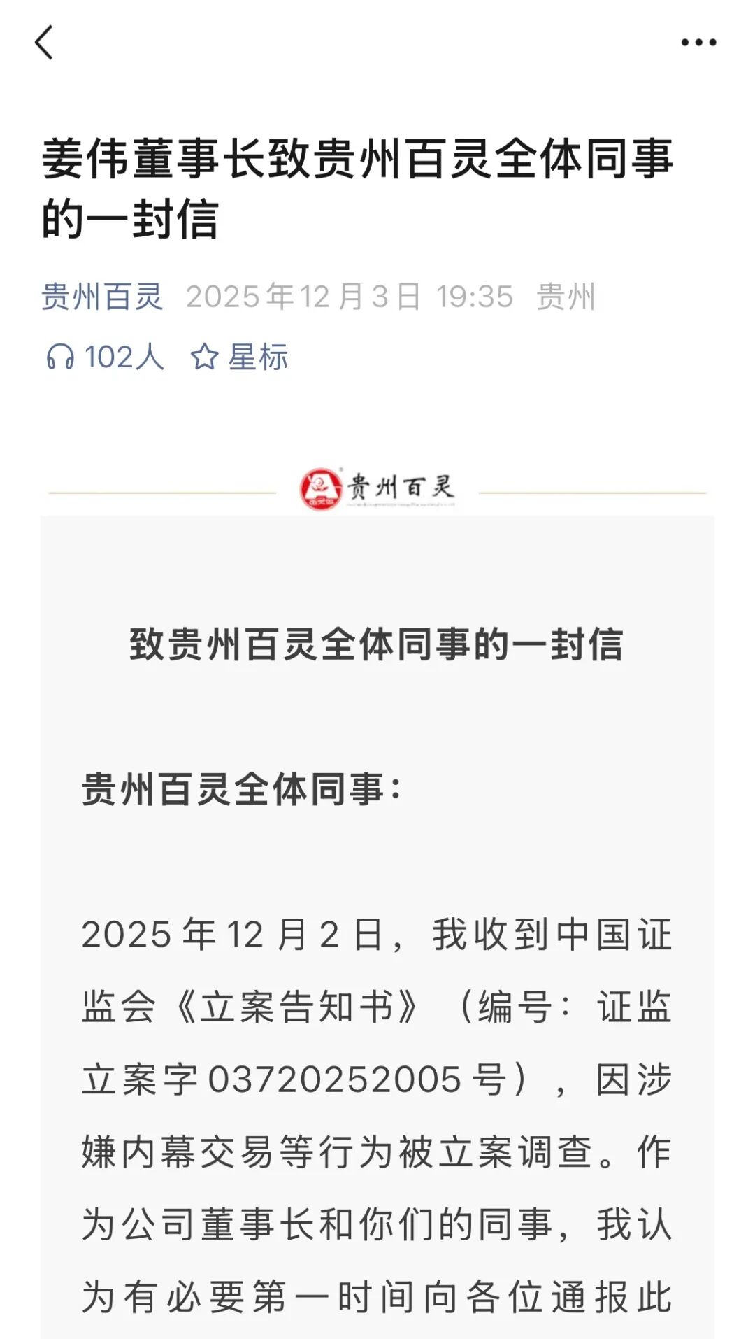 12月3日晚间,贵州百灵微信公众号发布了姜伟的“致贵州百灵全体同事的一封信”。