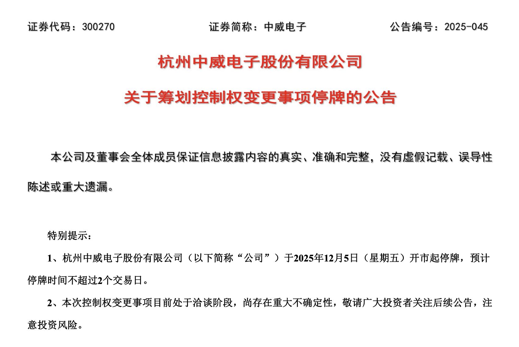 12月4日晚,中威电子(300270.SZ)公告称,公司于2025年12月4日收到公司控股股东新乡市新投产业并购投资基金壹号合伙企业(有限合伙)的通知,获悉其正在筹划公司控制权变更相关事宜,该事项可能导致公司实际控制人发生变更。为保证公平信息披露,维护投资者利益,公司股票自2025年12月5日上午开市起停牌,预计停牌时间不超过2个交易日。