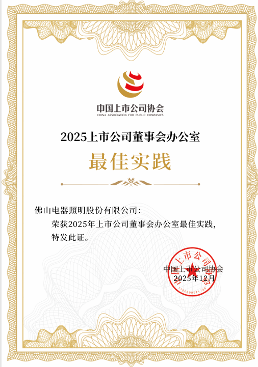 近日,中国上市公司协会(以下简称“中上协”)公布“2025上市公司董事会办公室最佳实践案例征集活动”评选结果。佛山照明凭借在信息披露、公司治理、投资者关系、ESG管理等领域的差异化创新实践与显著成效,获评“2025上市公司董事会办公室最佳实践案例”。
