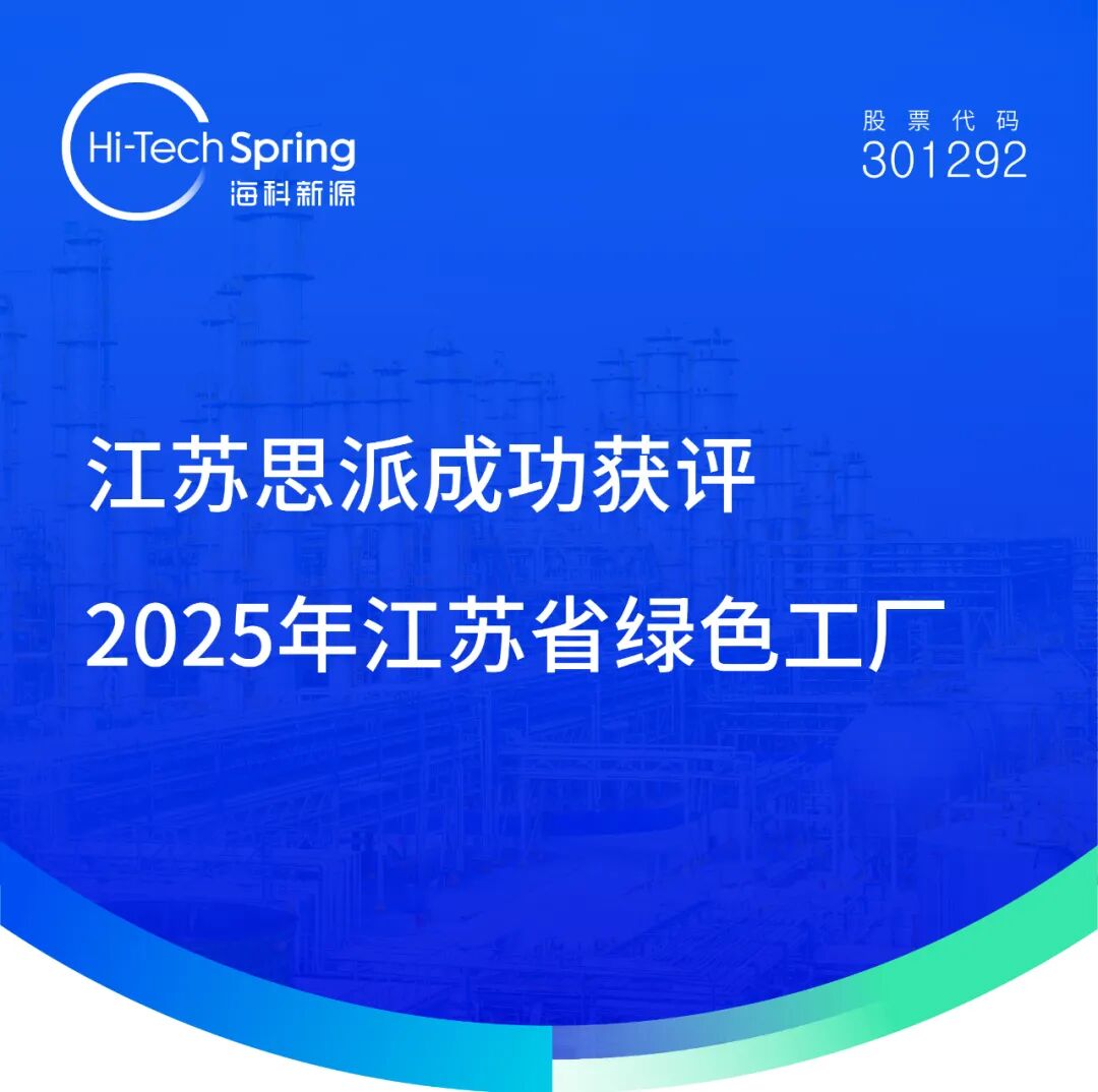近日,江苏省工业和信息化厅正式公布2025年度江苏省绿色工厂名单,海科新源公司旗下全资子公司——江苏思派新能源科技有限公司(以下简称“江苏思派”)凭借在绿色生产、节能降耗、生态保护等方面的卓越表现,经过严格评审,成功获评2025年“江苏省绿色工厂”称号。这一荣誉不仅是对江苏思派绿色发展成果的肯定,更是其作为海科新源重要战略支点,推动公司向绿色低碳、高质量可持续发展迈进的生动体现。