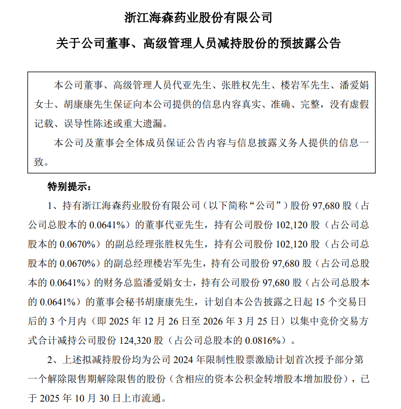 12月5日,海森药业(001367.SZ)发布公告,公司部分董事、高级管理人员计划自本公告披露之日起15个交易日后的3个月内(即2025年12月26日至2026年3月25日)以集中竞价交易方式合计减持公司股份12.43万股(占公司总股本的0.0816%)。