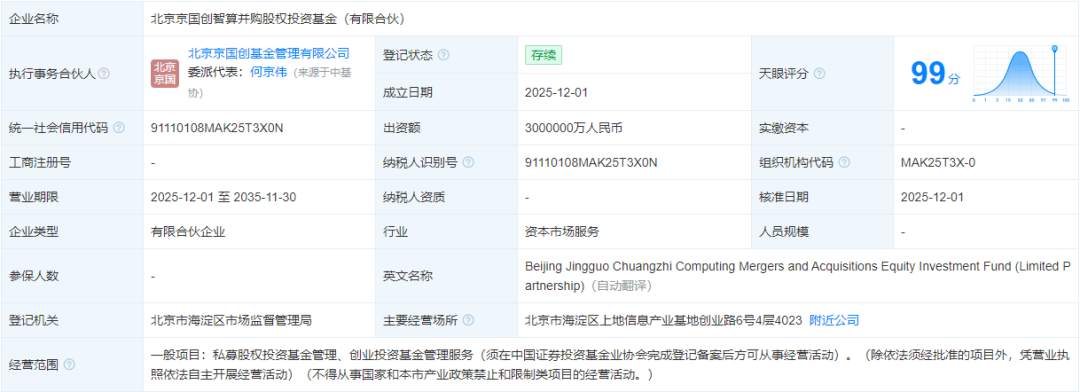 天眼查工商信息显示,近日,北京京国创智算并购股权投资基金(有限合伙)成立,位于北京海淀区,出资额300亿元人民币。