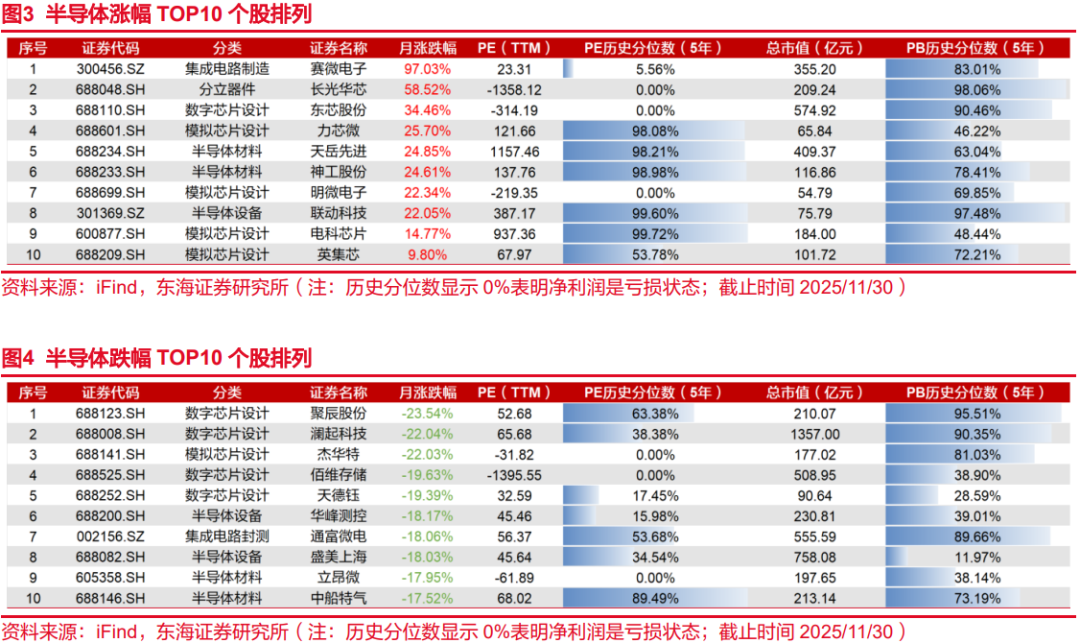 (3)半导体行业涨幅最高的个股是赛微电子(+97.03%),跌幅最大的个股是聚辰股份(-23.54%)。如下图所示是半导体行业近30日的涨跌幅TOP10个股,整体上大部分半导体个股在11月份股价均有所下跌,少数股价收涨。