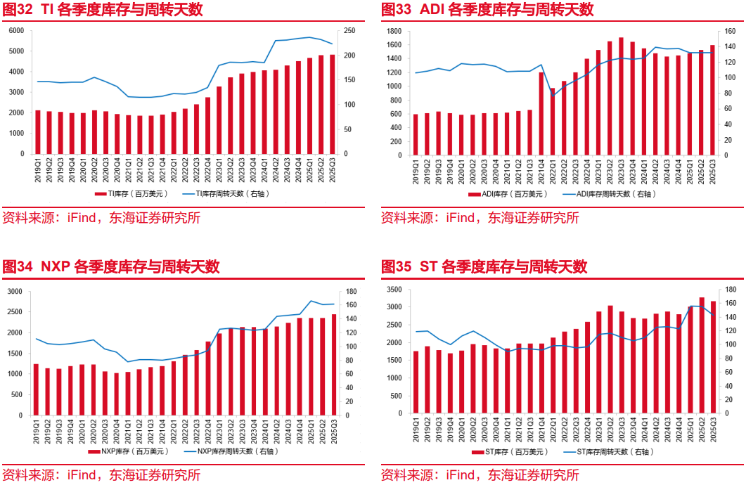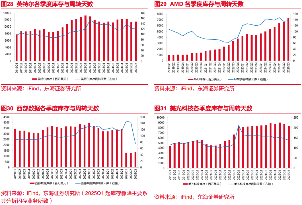 (2)当前全球各大芯片大厂的库存与周转天数依然维持较高分位。如下图所示,大多数CPU、存储、模拟、功率的全球龙头企业的库存水平绝对值在2024年开始继续攀升,周转天数也在缓慢上升,部分企业2025Q3环比Q2周转天数有所下降,但库存仍维持高位,从而表明全球的企业库存水平依然较高。