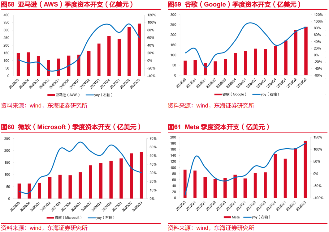 (2)AI基础设施建设推动2025Q3海外代表云服务厂商资本开支继续维持增长态势。亚马逊、谷歌、微软、Meta在2025Q3资本开支分别达到342.28、239.53、193.94、188.29亿美元,同比分别增长60.86%、83.39%、29.96%、124.42%,环比同样继续维持上行态势,2024全年资本开支分别同比增长61.34%、62.89%、57.81%、37.16%,头部云厂商在AI领域投资强度仍未放缓,体现其对AI长期增长潜力的信心。
