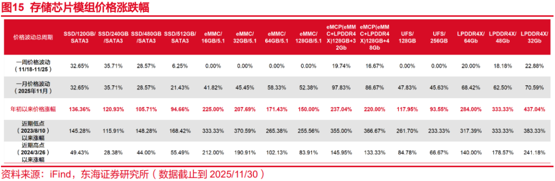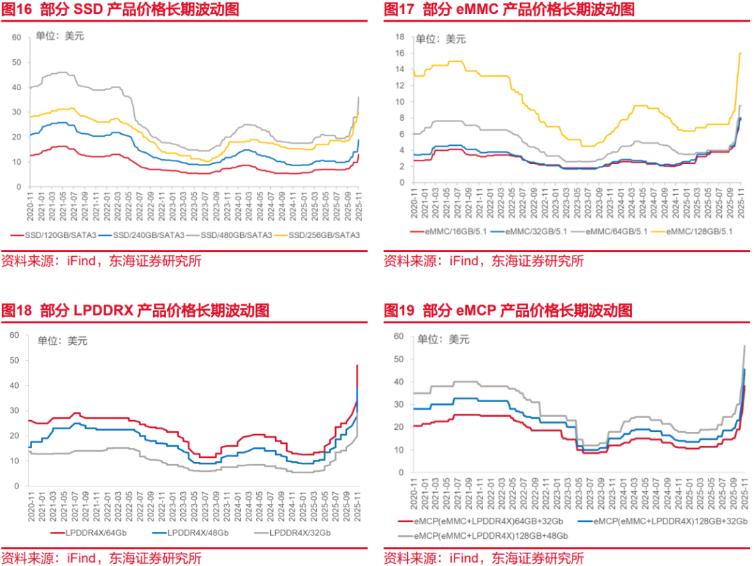 (3)从存储模组长期价格来看,呈现显著的周期波动特性,目前价格处于阶段性底部向上特征,表示市场短期需求回暖。下图是存储模组SSD、eMMC、LPDDRX、eMCP的不同产品价格波动图,中长期来看价格呈现明显的周期波动特性,2024年4月份的产品价格呈现阶段性的顶部特性,2025年2月份起在价格下行趋势中逐步趋于稳定,3月份价格开始上涨,4月至10月延续上涨趋势,11月价格大涨。历史上每次模组价格大幅上涨,需求端均有较大程度的复苏,短期内价格处于底部向上特性,一定程度反映了市场需求相对复苏。