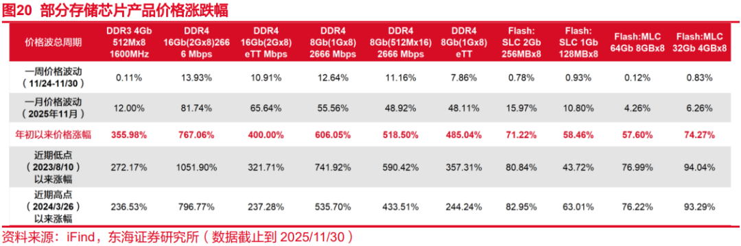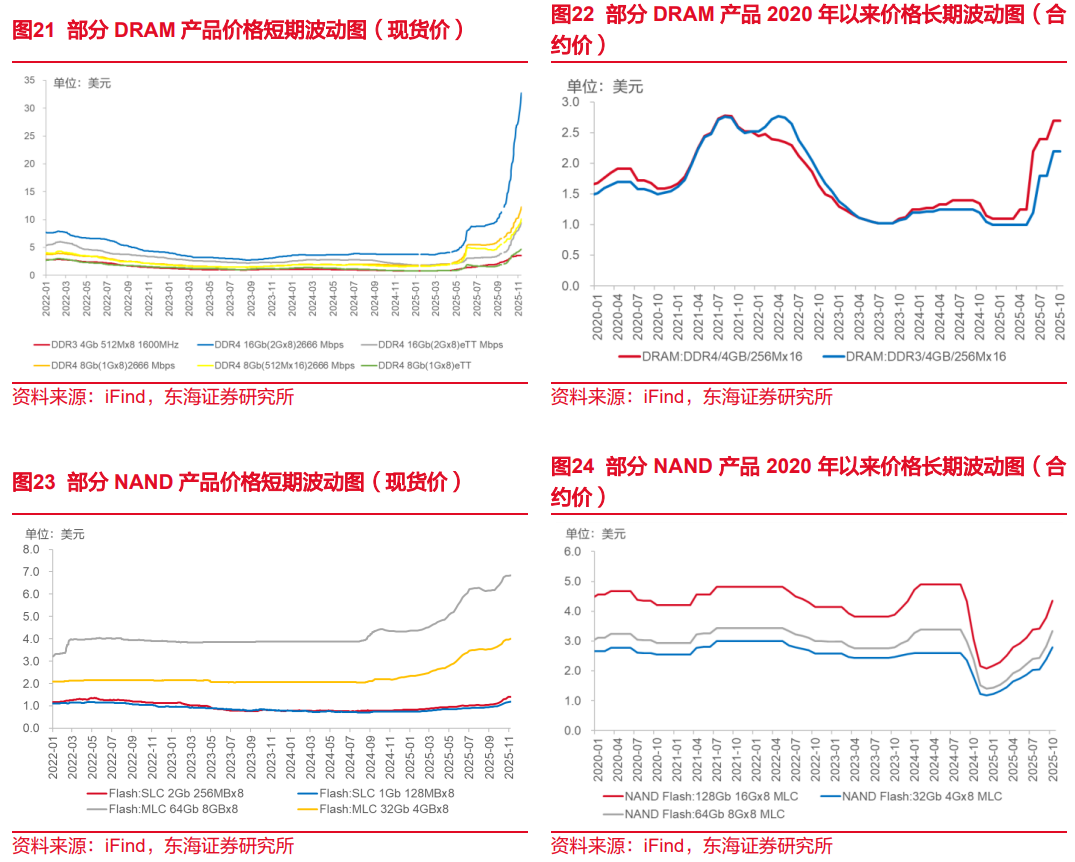 (5)11月份存储芯片DRAM价格大涨,Flash价格仍在持续上行,12月份或将保持上行的趋势。从长周期来看,存储芯片的价格也呈现一定的周期波动,当前部分存储厂商释放了涨价预期,2025年3月起存储芯片的价格有所上涨,6月起DDR4价格大幅上涨,主要系在头部存储厂商逐渐停产DDR4转向DDR5的背景下,买方提前备货等市场需求增加推动价格高升,11月份存储芯片DRAM价格迎来新一波暴涨,Flash价格仍在持续上行,12月份存储芯片的价格或继续保持上行格局。