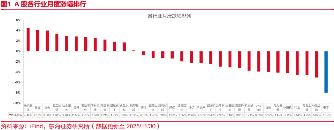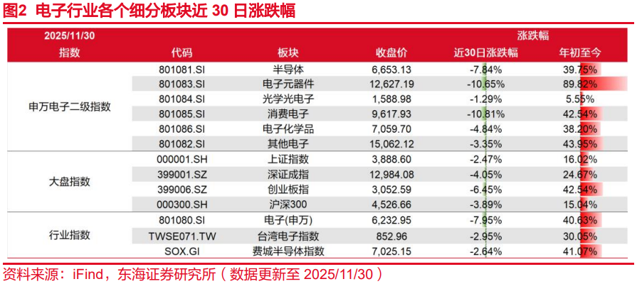 (1)申万电子行业11月涨跌幅为-7.95%。如下图所示,在申万31个行业中,申万电子行业涨跌幅为-7.95%,同期沪深300涨跌幅为-3.89%,超额收益率为-4.06%。