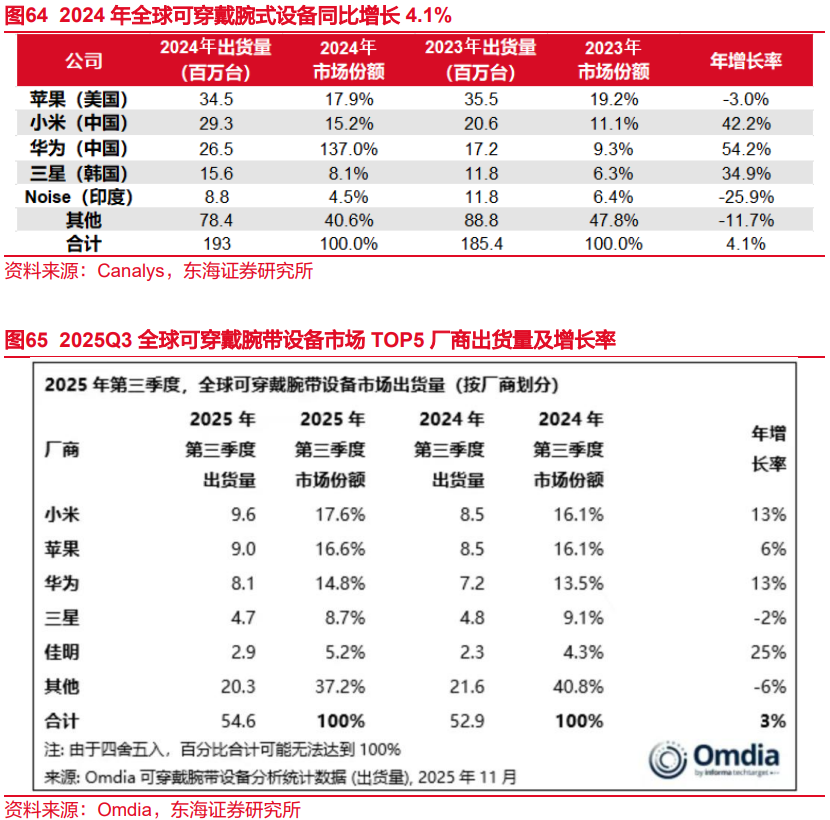 (2)2024年全球可穿戴腕式设备合计增长4.1%,出货量达1.93亿部,2025Q3出货量同比增长3%,达0.55亿部,2025全年有望增长8%。智能手表与手环在TWS耳机快速的渗透后,近些年也在快速加速渗透,相对来说智能手表具备通话等更完备的功能在备受海外市场偏好。一方面随着技术迭代,手表与手环的零组件价格不断下降被消费者接受;一方面智能穿戴加速向印度、东南亚等区域渗透,全球销量还有较大的增长空间,2023、2024年全球可穿戴腕式设备市场连续两年实现增长展现复苏态势,中国及新兴市场的强劲需求成为主要增长动力,基础手表和基础手环推动了入门级用户的增长,苹果、小米、华为等头部品牌竞争加剧,市场格局进一步演变。2025年或将继续保持增长。