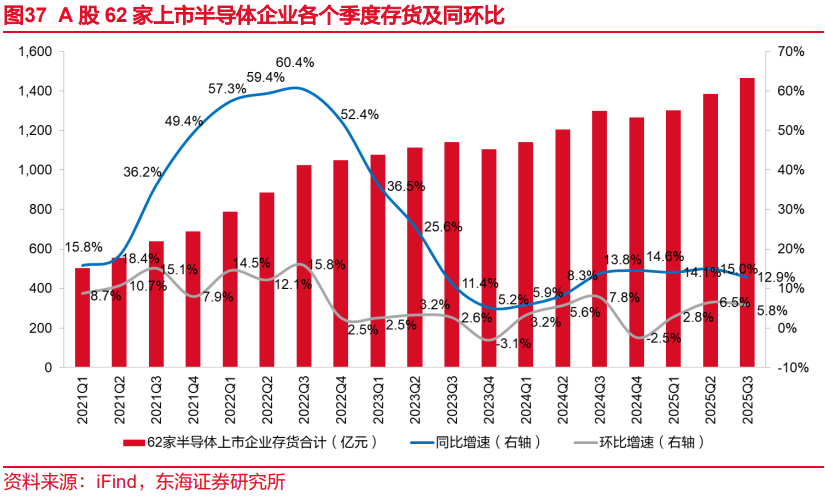 (4)2025Q3我国A股62家半导体上市企业库存水平同比增长12.9%,环比增长5.8%。如下图所示,我国62家上市企业库存合计从2023年以来整体绝对值维持较高水平,2025Q3整体库存同环比都有所上升,去库压力较大。