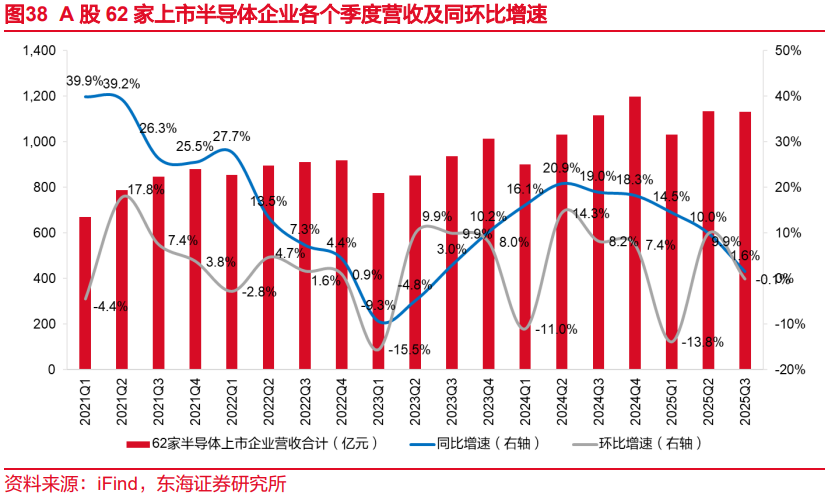 (5)62家A股上市半导体公司2025Q3营收同比为1.6%,环比为-0.1%,2025Q2营收同比为10.0%,环比为9.9%,Q3回落或是季节性因素所致。