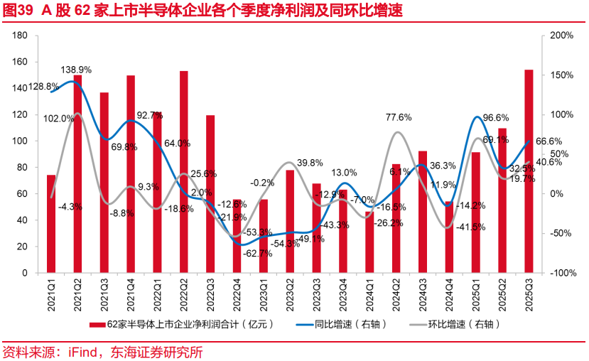 (6)62家A股上市半导体公司2025Q3净利润同比为66.6%,环比为40.6%,国内半导体企业净利润表现在2025Q3有进一步的好转。