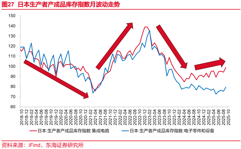(1)10月份日本生产者成品库存指数显示半导体与电子库存指数底部震荡。如下图所示,我们根据日本生产者成品库存月数据,自2023年开始大幅下滑,从2024年9月份开始略微有所上涨,一定程度表示在2024Q3的备货旺季结束后,渠道库存消化放缓,库存有所回升。2025年10月份库存指数仍底部震荡,反映出2025年下半年下游客户开始备货,去库存持续推进。