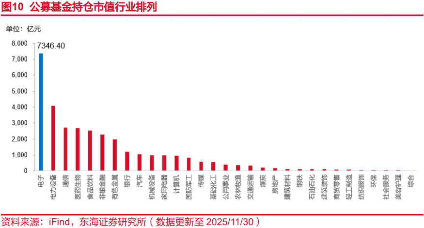 (2)从2025Q3数据来看,公募基金持仓的股票市值中,电子行业排在第一位,高达7346.40亿元。如下图所示是最新的公募基金的持仓市值排列,持仓市值超过2000亿元的行业有电子、电力设备、通信、医药生物、食品饮料、非银金融,电子板块是公募基金高配的行业。