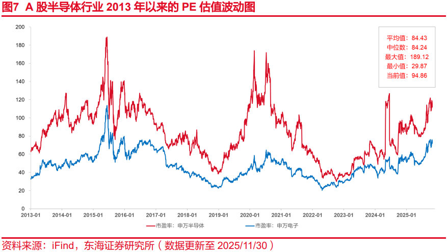 (1)半导体近期估值小幅震荡,主要系AI等概念催化以及企业披露三季度业绩报告所致。如下图是A股半导体行业的PE估值从2013年以来的波动图,整体上估值波动方差较大,最高值高达189.12,最低值只有29.87。由于市场对半导体的长期成长性预期较高,平均PE为84.43,中位数PE为84.24。