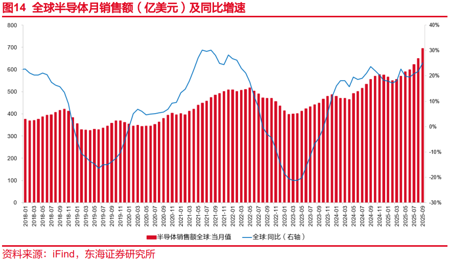 (1)全球半导体9月份销售额同比为25.13%,2025年1-9月累计同比为20.42%。全球半导体销售额呈现一定的周期变化,从销售额的同比增速来看,在2023年2月份增速见底后,跌幅开始收窄,2023年11月份同比增速转正,后续增速不断爬坡,但2024年10月起增速放缓。从销售额看,当前全球半导体销售额绝对数额也在不断增长,2024年12月起销售额略有回落,但2025年3月起销售额环比又有所回温,显示出全球半导体景气回升仍是发展主旋律。