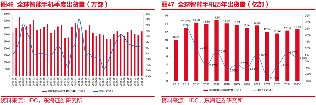 (2)全球智能手机2025Q3出货量同比为2.09%,2025年Q1-Q3累计同比为1.56%。如下图所示是全球智能手机各个季度出货量及同比,整体来看2023Q3开始同比增速转正,近4个季度的手机出货量维持弱复苏水平。长期来看,智能手机出货量从2017年创下14.9亿台的历史高点后,2023年创下7年的新低,出货量仅有11.62亿台。我们认为,尽管手机质量不断提升,置换周期也在增长,但在全球人口近80亿基础上,随着经济发展各区域收入水平不断提升,购买力长期在增长;同时,手机创新不断,AI功能、折叠屏、摄像高端化等技术进步与创新也在促进换机欲望,手机消费意愿长期存在,随着经济周期回暖,手机销量大概率逐步回升,IDC预计2025年全球销量或同比增长2.3%左右。