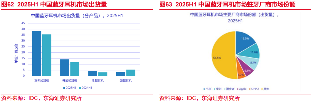 (1)中国TWS耳机2025H1出货3831万台,同比增长8.0%。TWS耳机占据全球智能穿戴出货量的一半以上,2024全年四个季度均同比增长,2025Q1延续增长态势,同比增长18%,出货量达7830万台。2025Q1前五大品牌合计占据52.8%的份额,除苹果、三星这样的高端品牌份额略有下滑外,其他品牌呈现正增长。2025年上半年中国蓝牙耳机市场出货量约5,998万台,同比增长7.5%。其中,TWS耳机市场出货量3,831万台,同比增长8.0%;入门级市场仍然为主要拉动力量,高端旗舰市场有所复苏。2025年上半年手机厂商在真无线市场出货量占比67%,相比去年同期增长16个点。在真无线耳机市场,部分手机厂商通过优化购机权益、提升产品附加值的策略,正逐步扩大市场覆盖与用户认可,推动份额稳步增长。2025年上半年,小米蓝牙耳机出货量达989万台,同比增长52.6%。其Redmi系列在入门级市场的细化布局,以高性价比叠加品牌效应持续吸引用户。同时,“国补”政策对手机市场的提振,也间接带动了配套耳机产品的销售。