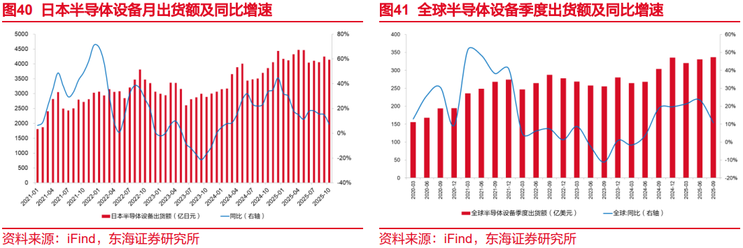 (1)日本半导体设备10月份出货额同比增长7.31%,2025年1-10月累计出货额同比增长17.51%,全球半导体设备2025Q3出货额同比增长10.80%,全球半导体设备采购力度有所增强。如下图所示,全球半导体设备出货额在2024Q1、Q2、Q3、Q4同比增速分别是-1.61%、3.80%、18.87%、19.70%,整体2024年半导体设备出货额来看,Q3、Q4出现了较大幅度增长,2025Q3同比增长10.80%,设备采购力度加强仍在持续。日本、北美、欧洲几乎垄断了全球的半导体设备的供应份额,全球设备出货额增长加快,显示出全球1-2年的产能供给有所增长。同时,日本设备出货额增长较快,可见在全球贸易管制的背景下,全球加大了对日本半导体设备的采购意愿。
