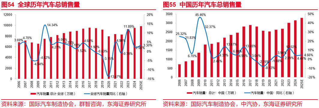 (2)2024年全球汽车总销量高达9531.47万辆,同比为2.65%,预计2025年全球总销量同比增长3.30%;2024年中国汽车总销量高达3143.6万辆,同比为4.46%,预计2025年中国总销量增长4.66%。如下图,根据国际汽车制造协会数据,长期来看,全球汽车总销量数据呈现一定的周期波动,2020年达到近10年的一个低谷,2020年销售量为7966.9万辆。2021年后呈现一定程度增长,2023年呈现高速增长,主要原因是新能源汽车的渗透率在快速提升。中国汽车总销量与全球周期趋势保持相对一致,但中国整体增速略快于全球,中国的新能源汽车渗透速度相对更快。2025年预计全球与中国的新能源车销售继续高速增长,一定程度加快了汽车总销售量,预计全球汽车销量增速为3.30%,中国汽车销量增速为4.66%。