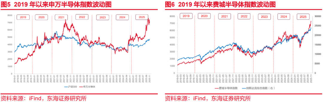 (4)短期来看,中国半导体指数表现较为震荡,指数走势与费城半导体指数走势相对背离。如下图是中长期申万半导体与费城半导体指数的波动图,2019-2022年整体上两者的正相关性较强,但2023年以后两者的波动走势出现一定背离,我们认为主要原因有几点,其一,东西方的宏观经济增速表现有一定的差异;其二,中国大半导体产业依然薄弱,在周期下行期中国大陆受到的业绩冲击更大;其三,AI的快速增长,核心受益的企业集中在海外。2024年10月份以后申万半导体指数呈现较大涨幅,这是因为在中国大陆的政策刺激作用下,指数走出相对独立的趋势。2025年4、5月指数均波动较大,主要系国际关税政策摩擦影响,2025年11月指数表现较为震荡,或一部分受AI行情催化,另一部分受企业财报季影响。
