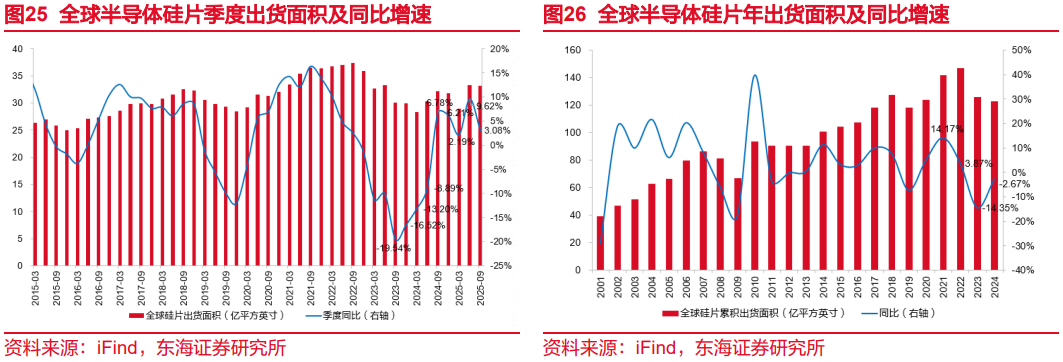 (6)全球半导体硅片面积2025Q3同比为3.08%,2025年Q1-Q3累计同比为4.99%,2025Q3同比增速相比Q2有所回落,但出货面积环比基本持平,需求回暖趋势明显。下图是全球半导体硅片出货面积及同比增速,短期来看全球硅片出货面积自2024Q3起单季度同比转正,全球需求在2025Q3延续了回暖态势。