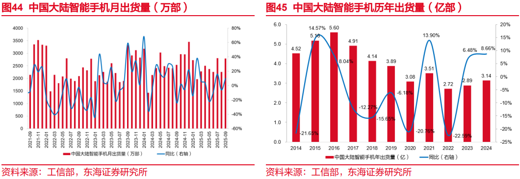 (1)中国大陆智能手机2025年9月份出货量同比为10.09%,2025年1-9月累计出货量同比为-0.32%。中国大陆智能手机出货量是中国大陆区域新手机需求,总体来看由于疫情原因,2022年与2023年上半年的基数较低,2023年9-12月份维持较高出货量。2024年中国智能手机出货量累计同比为8.66%,整体来看国内手机需求呈现回暖趋势。2025年2月出货量同比为37.91%,或是国补政策刺激所致,2025年3、4月同比增幅有所降低,5月起出现下滑,7月同比有所增长,8月再度回落,9月有所复苏。长期看,国内手机需求量从2016年5.60亿台下降到2024年3.14亿台,呈现较大幅度的需求下滑,主要原因是手机渗透率较高,手机质量不断上升后置换周期也在增长,同时经济不景气时居民置换手机的意愿相对更低。