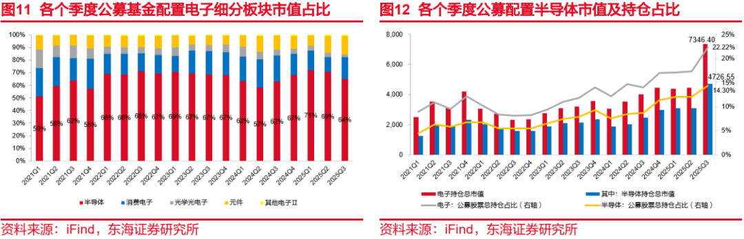 (3)从下图可知近3年来公募基金配置半导体的规模长期占据电子行业的6成左右,2025Q3占比为64.34%。如下图所示是各个季度公募基金配置电子与半导体的规模,可见半导体的市值长期在电子行业的6成以上,2025Q3来看公募基金配置半导体板块的市值高达4726.55亿元,半导体占比公募基金总持仓股票市值的14.30%。